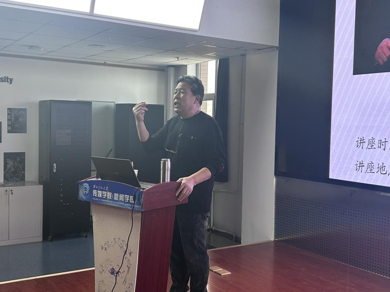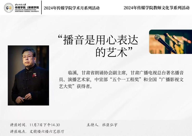 2024年11月7日下午2:30,甘肃省朗诵协会副主席临溪应邀我院师生开展了题为《播音是用心表达的艺术》的讲座。此次讲座由杜臣弘宇老师主持,金沙990活动大厅2024级研究生聆听了此次讲座并进行了深入的交流。