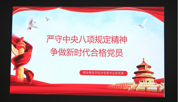 为深入贯彻中央八项规定精神学习教育,进一步加强党风党纪建设,增强入党积极分子的政治素养和纪律意识,近日,职业教育学院分党委开展了“严守中央八项规定精神,争做新时代合格党员”专题党课。本次党课由职业教育学院分党委书记段永刚主讲,116名入党积极分子参与现场学习。段永刚首先强调了深入贯彻中央八项规定精神学习教育的核心内容和重要意义。他指出,中央八项规定是新时代党的作风建设的开篇之举,彰显了党中央解决党内突出问题的坚定决心,...