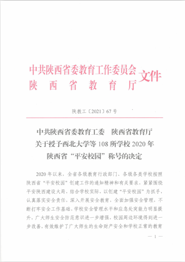 日前,中共陕西省委教育工委、陕西省教育厅联合印发《关于授予西北大学等108所学校2020年陕西省“平安校园”的称号的决定》,beat365正版唯一官网必一荣获陕西省“平安校园”称号。这是beat365正版唯一官网必一继2008年、2014年获得省级“平...
