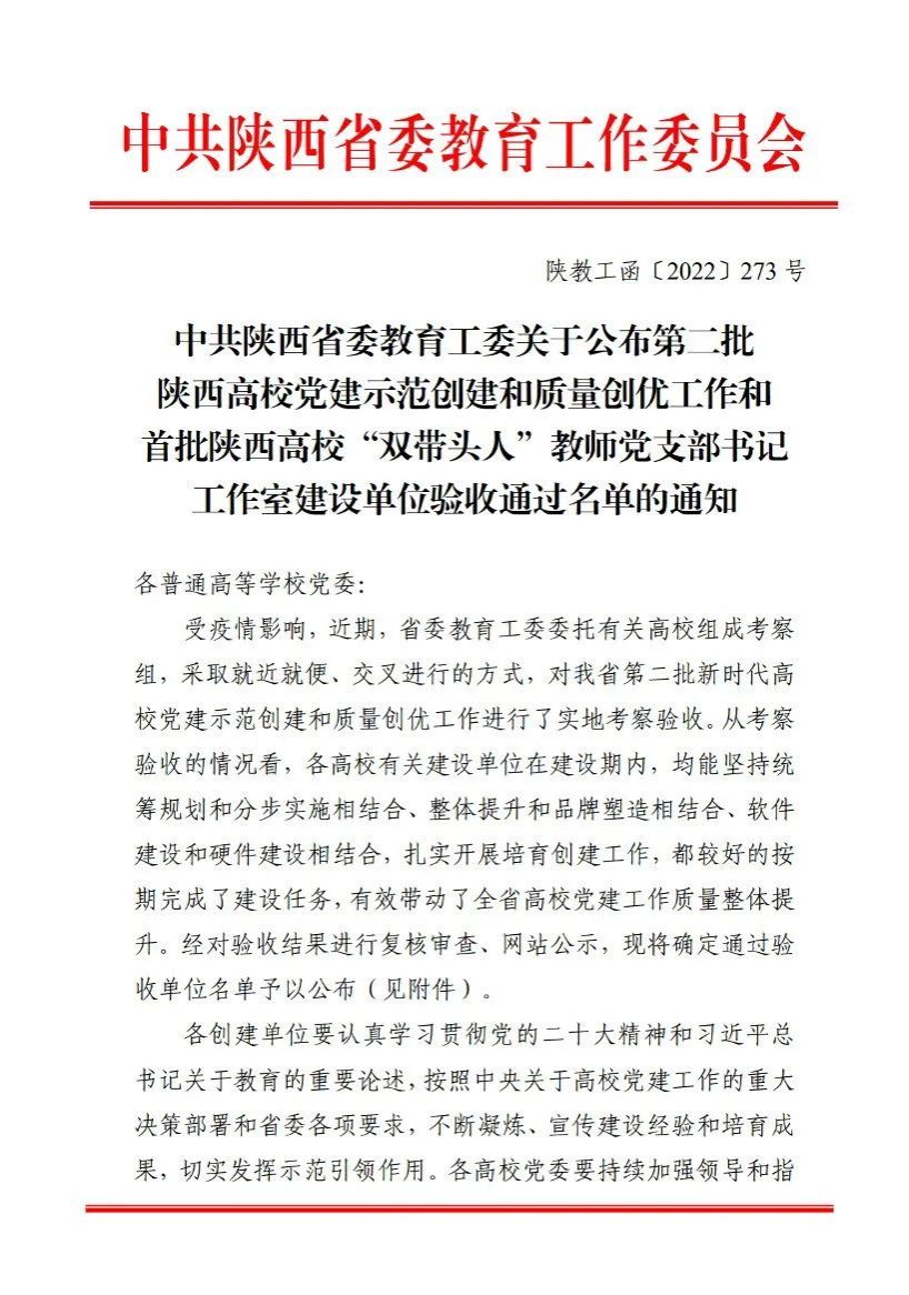 近日,中共陕西省委教育工委发布《关于公布第二批陕西高校党建示范创建和质量创优工作和首批陕西高校“双带头人”教师党支部书记工作室建设单位验收通过名单的通知》,beat365后勤集团第二党支部和第三青年社区第一学生党支部分别通过了“全国党建工作样板支部”和“全省党建工作样板支部”验收。学校后勤集团第二党支部围绕“七个有力”目标,以党政融合与协同创新为抓手,充分发挥党支部战斗堡垒作用,以提升组织力为重点,着力发挥政治引领,...