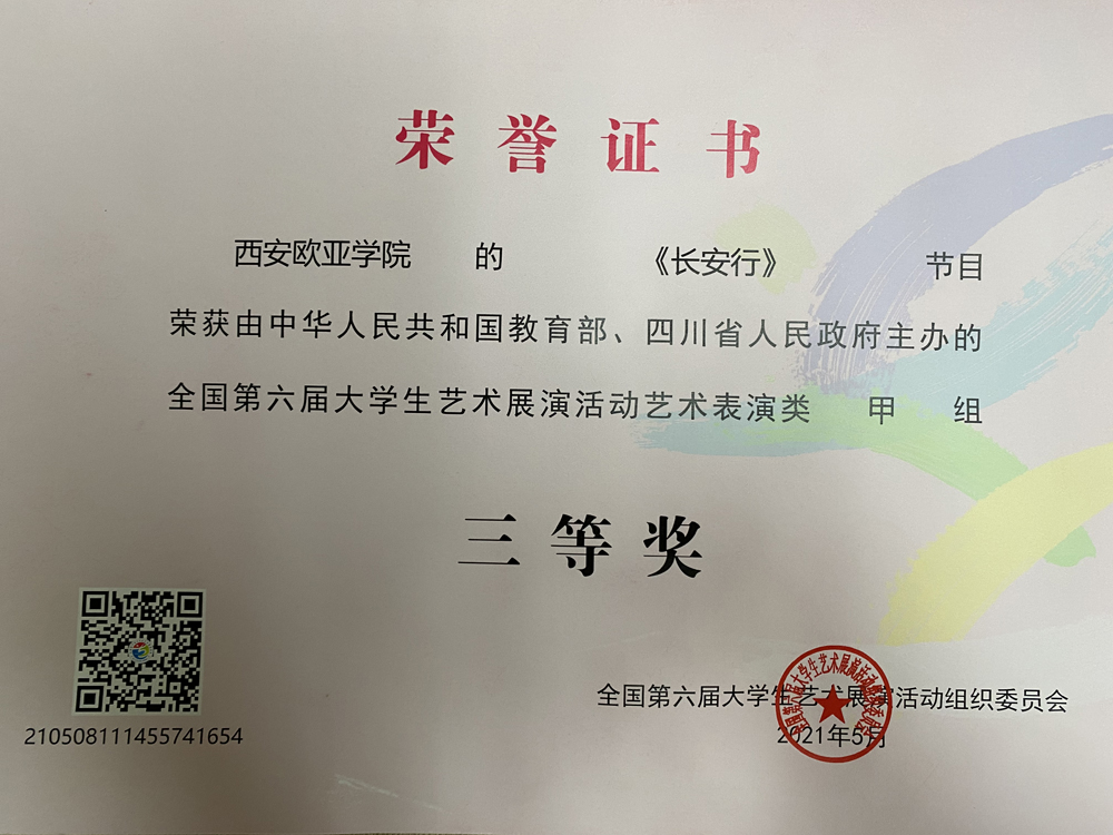 2021年5月12日由中华人民共和国教育部、四川省人民政府主办的全国第六届大学生艺术展演活动在历时8天的精彩竞赛角逐中于四川成都圆满落幕。经学校推荐、陕西省教育厅评选推送,beat365名誉校长王改民的书法作品《如松之盛》荣获校长风采奖,beat365大学生艺术团参赛曲目《长安行》,荣获全国第六届大学生艺术展演三等奖。