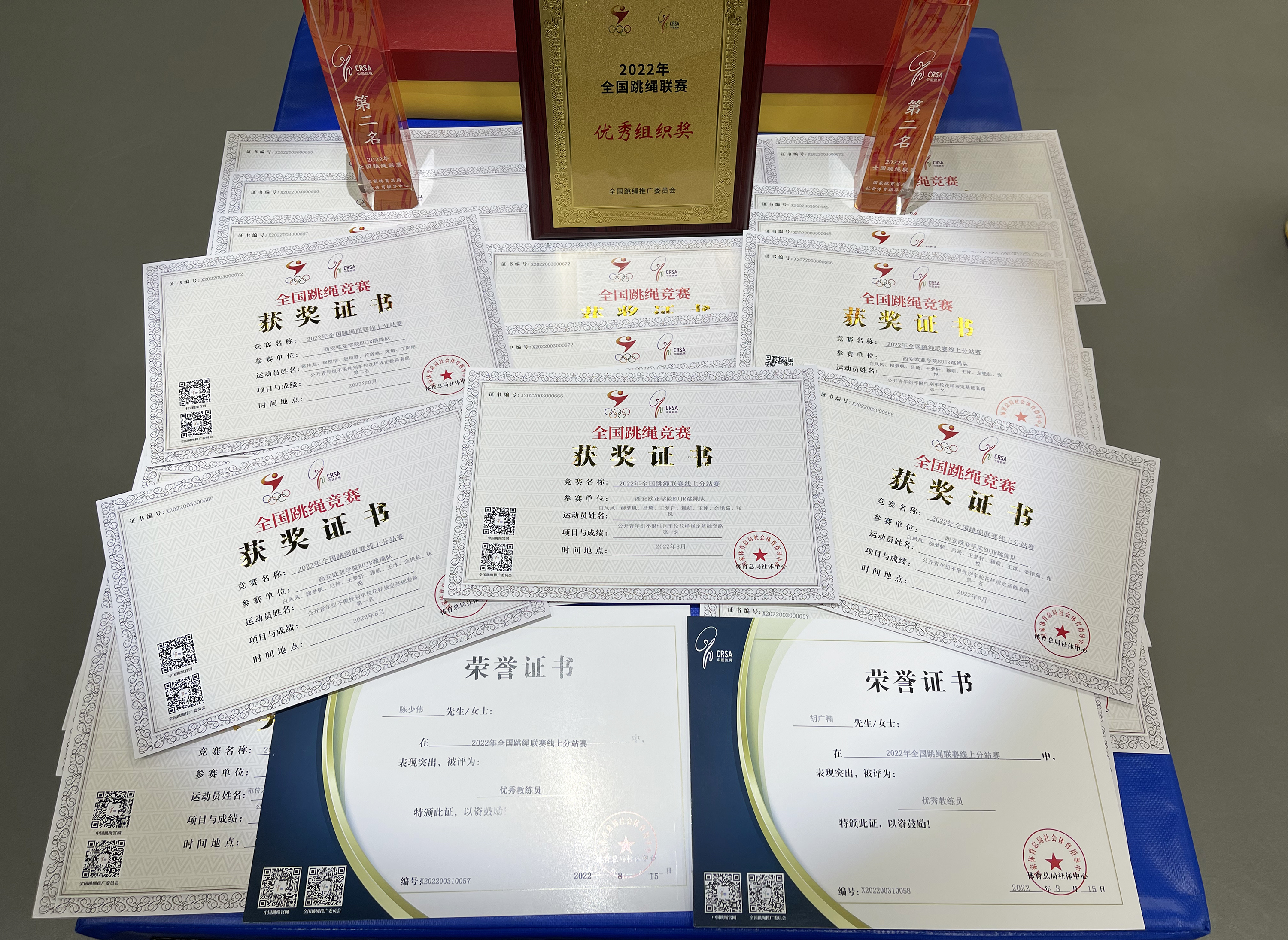 近日,2022年全国跳绳联赛线上分站赛发布成绩公告,beat365EUJR跳绳队在个人花样集体、车轮花样集体等多个单项斩获1项冠军、2项亚军、1项第四名的佳绩,并荣获全国跳绳联赛“优秀组织奖”。