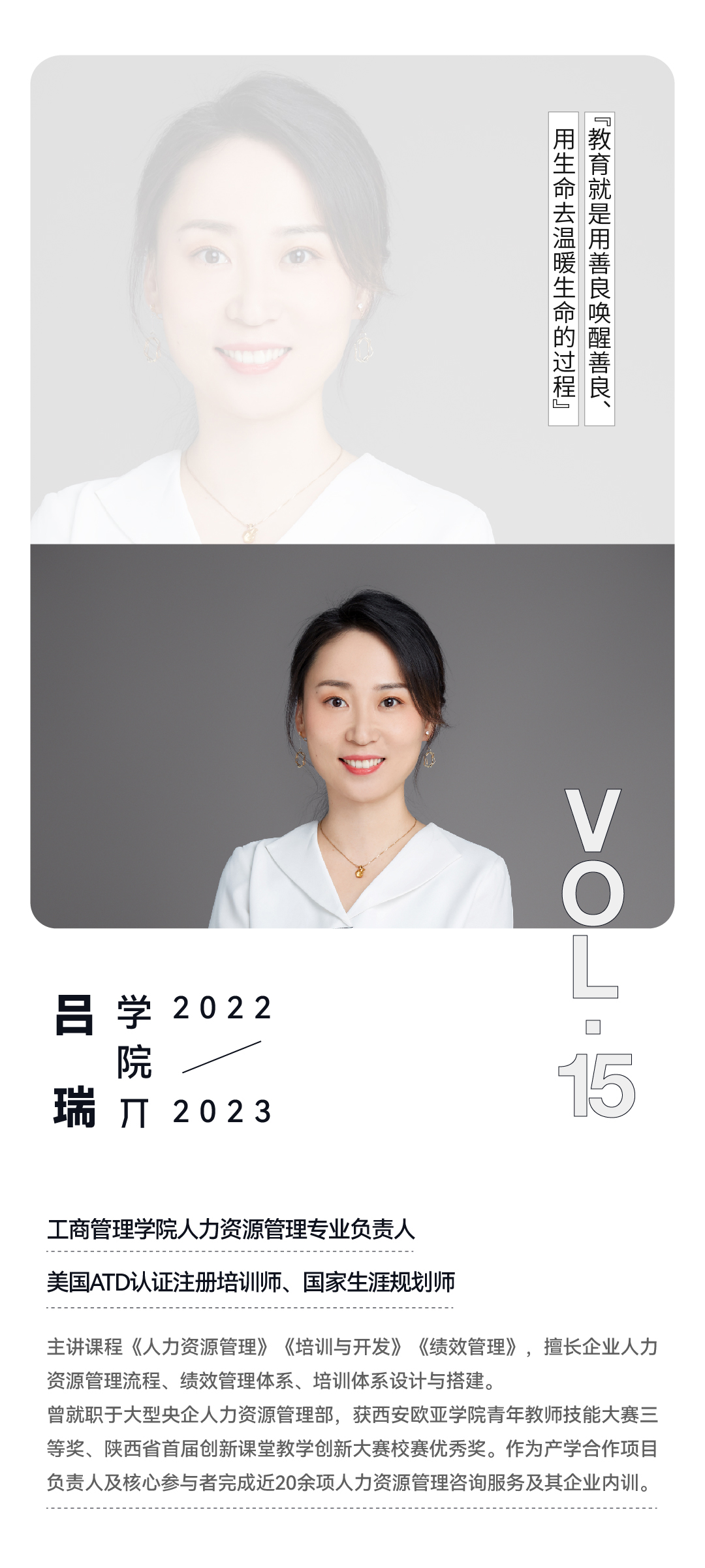 “教育就是用善良唤醒善良、用生命去温暖生命的过程。”当吕瑞老师说出这句话时,你能很清晰地感受到来自于它的份量。那是一种极大的责任感,是身为老师,去最大限度地为学生发展提供支持的一份笃定。所以她的教学并不是单向的传授,在她的课堂上,一门充满了商务气息的《绩效管理》,被带入丰富的教学模块,学生们在不同的情境里体验、体悟,探讨与思考随处发生。