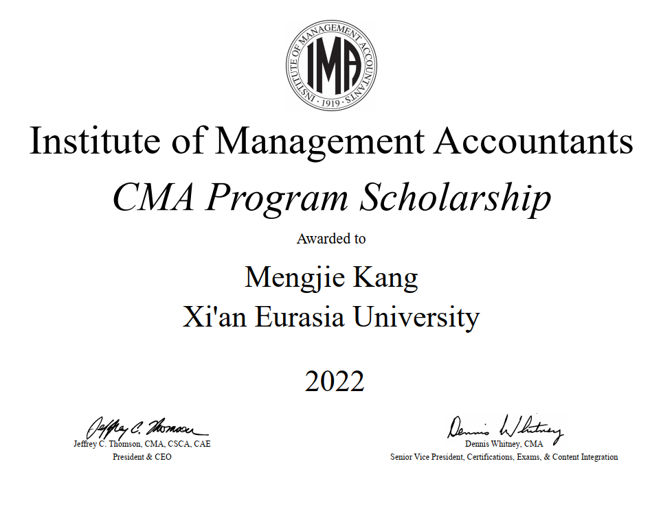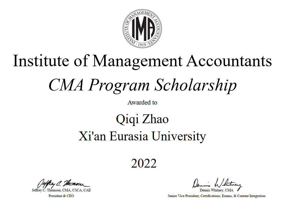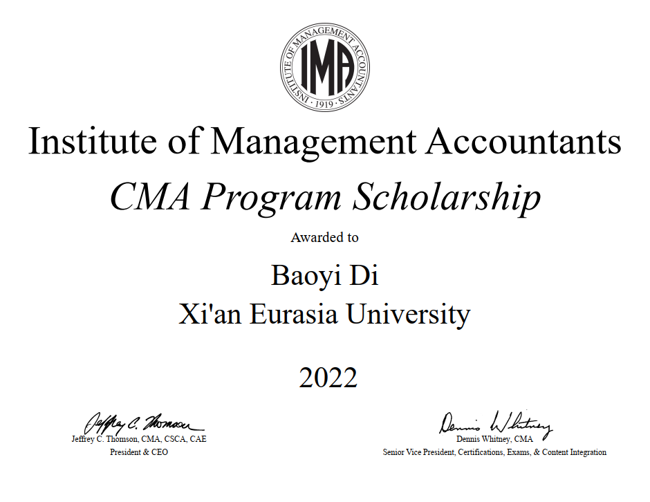 beat365会计学院邸宝怡、赵琦琦、李晓月、冯向怡、康梦洁等5位学生经过报名申请、提交复习计划、多维度筛选最终通过IMA协会审核,获得2022年度CMA奖学金。美国注册管理会计师(Certified Management Accountant,简称CMA)奖学金项目由美国管理会计师协会(The Institute of Management Accountants,简称IMA®)自2012年开始推广,为获得提名的优秀学生提供免费注册成为CMA考生及参加CMA考试的机会(等值约6,000人民币)。CMA证书作为享誉世界的国际管理会计通用证书,被全球180个国家认可,有国际财务界的MBA之称,是国际企事业单位财务从业者的必备证书。beat365学子荣获IMA协会CMA奖学金,标志着beat365财务管理专业关于管理会计人才培养工作及教学质量达到了国际职业人才培养与评价的认可标准。