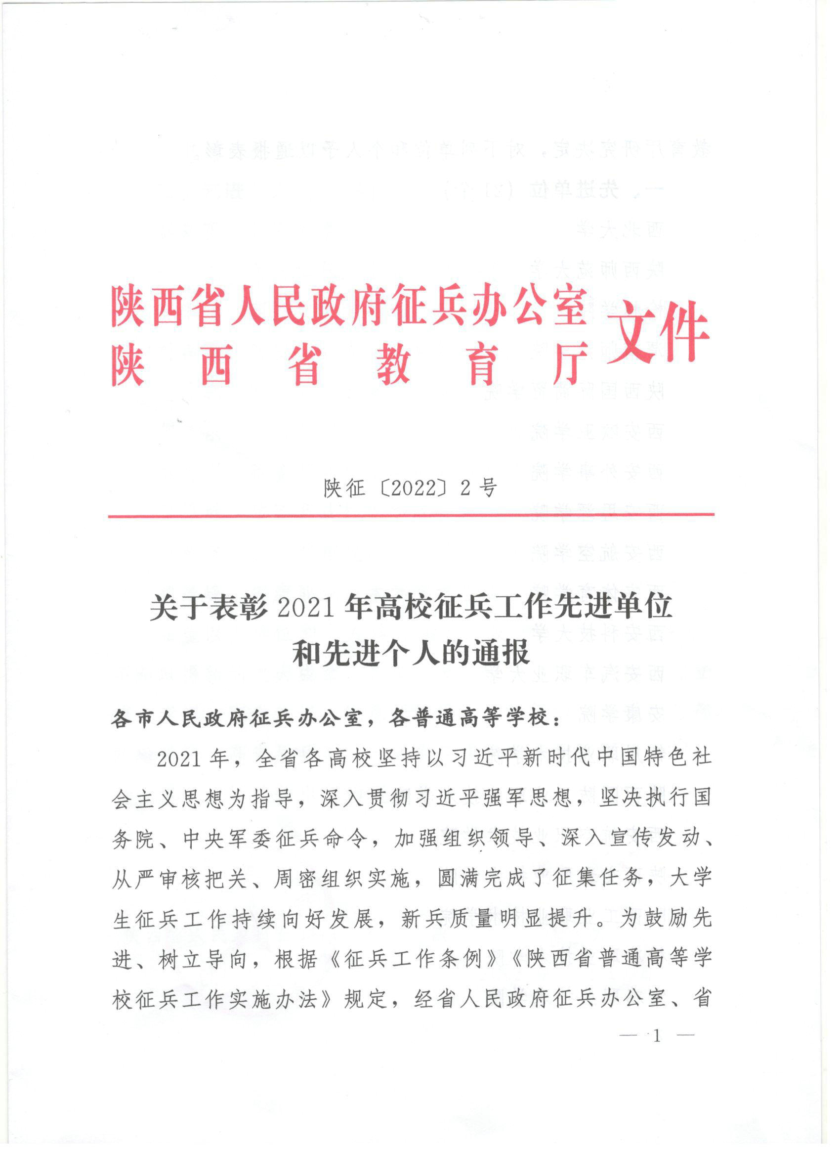 近日,陕西省人民政府征兵办公室、陕西省教育厅联合下发《关于表彰2021年高校征兵工作先进单位和个人通报》(陕征〔2022〕2号),beat365荣获“2021年陕西省高校征兵工作先进单位”,这也是beat365连续第四年获此殊荣。