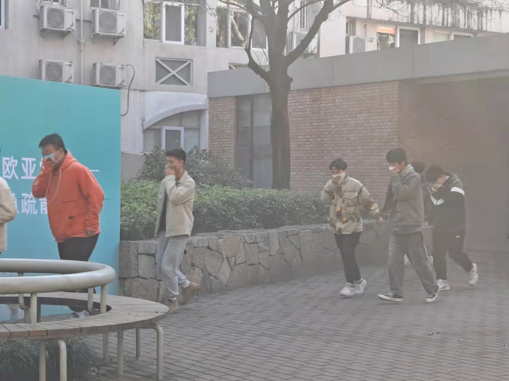 下午14:00,随着警报哨声吹响,北3公寓楼内外烟雾四起,消防疏散应急演练正式拉开帷幕,各楼层疏散员快速反应,从三层“着火点”开始由高向低引导在宿学生安全有序从疏散通道撤离到达疏散集合地。