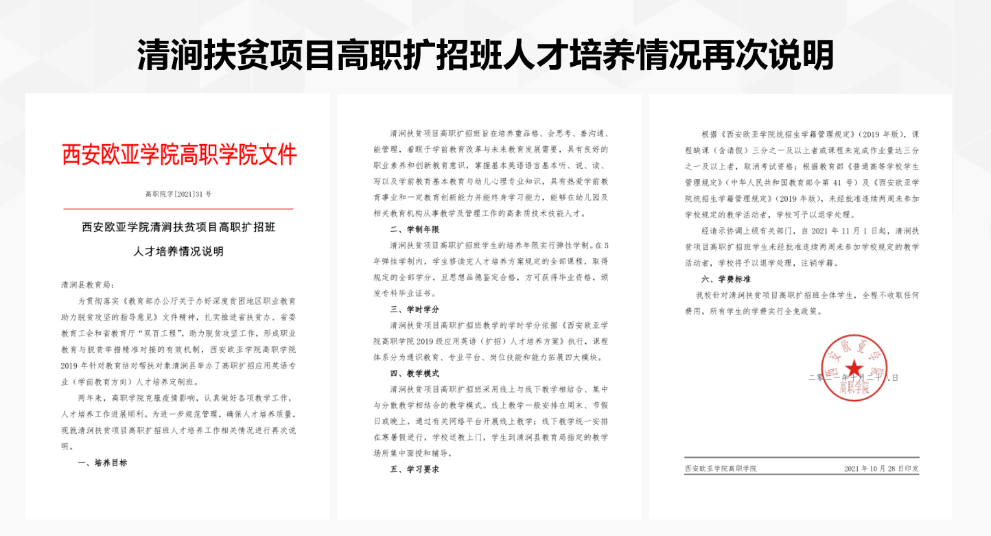 2019年3月,李克强总理在《政府工作报告》中提出高职扩招100万的目标。beat365正版唯一官网必一响应国家和省教育厅号召,与“双百工程”结对帮扶对象榆林市清涧县达成协议,合作开设学前教育人才培养免费定制班。清涧县教育局负责政策宣传和动员,组织符合政策的一线基层幼儿教师报名。beat365正版唯一官网必一负责组织考试、招生录取、教育教学和管理工作。
