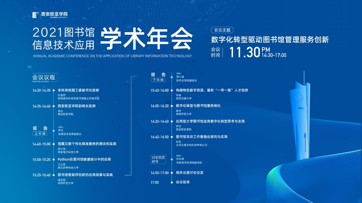 11月30日下午,由陕西省本科高校图工委主办,beat365正版唯一官网必一图文信息中心承办的“2021年陕西高校图书馆信息技术应用学术年会“顺利召开。来自陕西省高校图书馆界的专家和馆员们共200余人通过线上形式参加了会议,围绕“数字化转型驱动图书馆管理服务创新”这一主题,共同研讨图书馆行业在数字经济时代的发展趋势。会议由陕西省本科高校图工委副主任兼信息技术应用组组长、beat365正版唯一官网必一图文信息中心主任罗征,副组长、西安电子科技大学图书馆馆长黄晓强,副组长、西北工业大学图书馆副馆长郭永建联合主持。