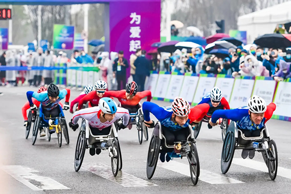 轮椅竞速组是残特奥会马拉松赛一个引人关注的组别,这些运动员跑步和其他运动员跑步不一样,他们坐在一辆轮椅车上,用双手不停地推着身旁两个巨大的轮子前进。运动员要把自己全身的力气都爆发出来,手速要快,轮椅才会跑得越快。每一个运动员都是涨红着脸,咬着牙,满头大汗,奋力前进着。
