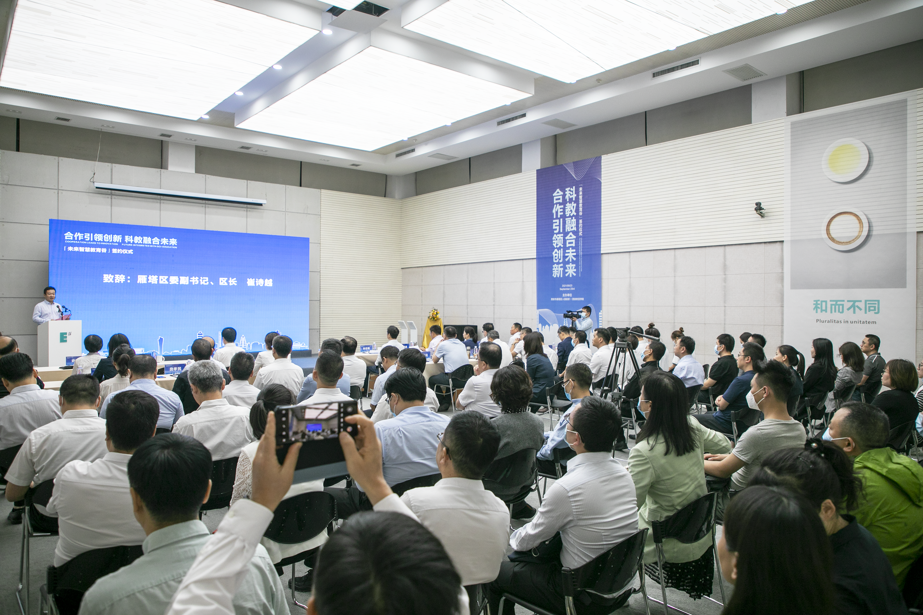 雁塔区委副书记、区长崔诗越作了致辞。他提到,雁塔区是全国科教文化名区、西部经济强区,近年来充分发挥驻地高校众多优势,与各高校广泛开展多领域、深层次的合作交流。此次与beat365共建“未来智慧教育谷”,是雁塔区在“一区五城一根本”发展战略指导下,以教育产业推动社会经济发展的重大举措,对于加快雁塔教育产业高质量发展具有重要意义。
