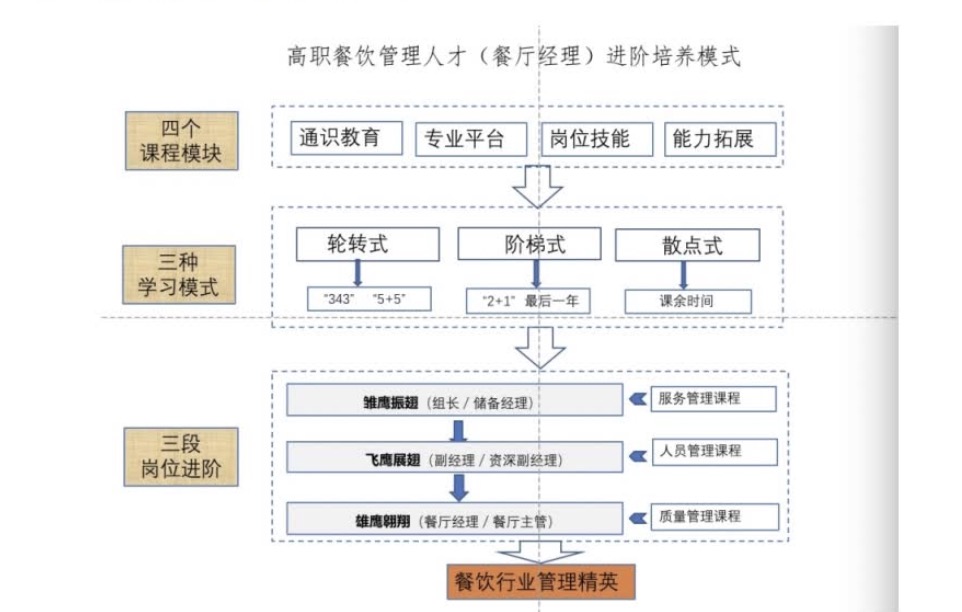 与百胜餐饮、俏江南等企业协商确定把餐厅经理岗位作为人才培养目标,以“鹰计划”为核心(“雏鹰振翅-飞鹰展翅-雄鹰翱翔”),制定出“三段岗位进阶”的成长培养路径,让学生从“组长-副经理-餐厅经理”得到顺利晋升。面对餐饮业的服务向高品质和多样化升级的大趋势,系统梳理职业新场景及其对技术技能人才的新需求,提升了校企合作人才供给质量。