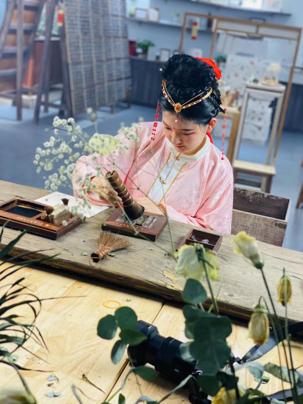 整齐排列在字架上数以万计浴火重生的活字整齐排列在字架上,从中拣拾心仪的文字;在水箱中捞纸置花,抚摸自己制作的纸张上,独属于手工的淡淡凸痕与纹路质感;在满架花材中拣拾花朵草木制成工艺品,让花成为生活……手中小小的美学作品,承载着步履匆匆的都市中难得的慢生活美感。