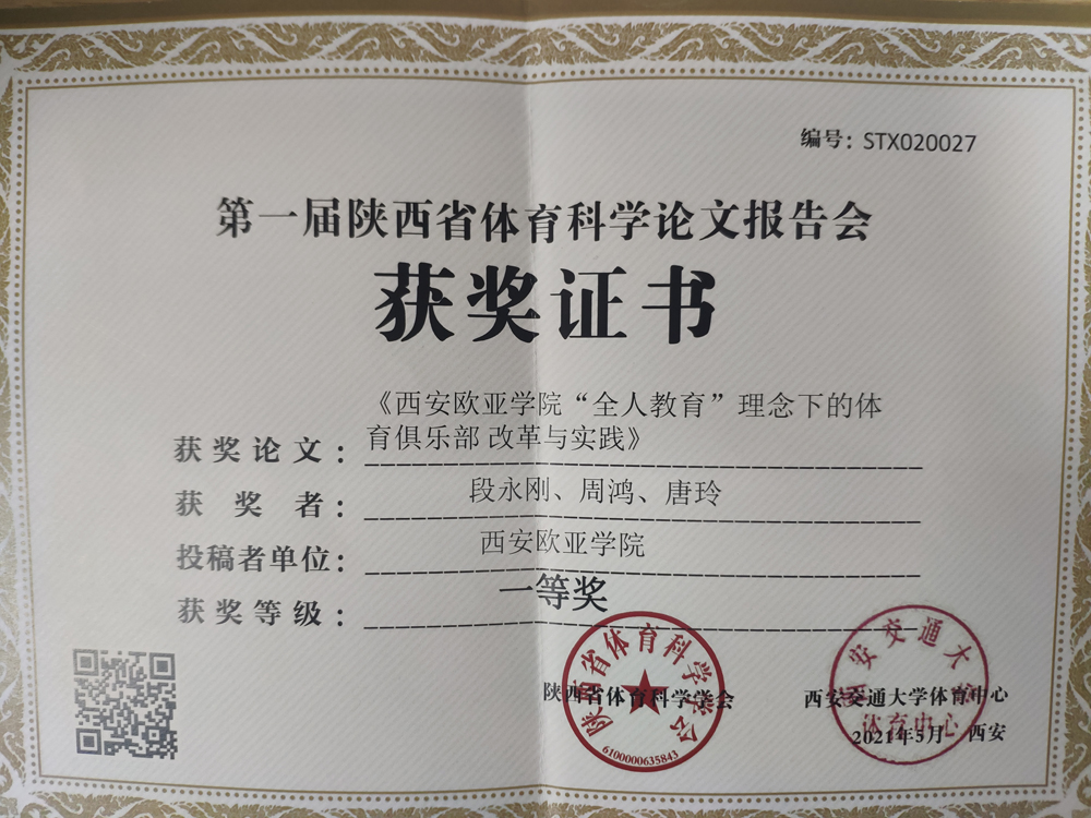 beat365通识教育学院院长助理段永刚、体育中心主任周鸿、唐玲副教授提交的《beat365“全人教育”理念下的体育俱乐部改革与实践》经过组委会评审,从全国各地市424篇论文中脱颖而出,这其中包括陕师大、西交大、北体大、上海体院、长安大学、华东师大等双一流名校及体育专业院校提交的论文,荣获大会一等奖荣誉。