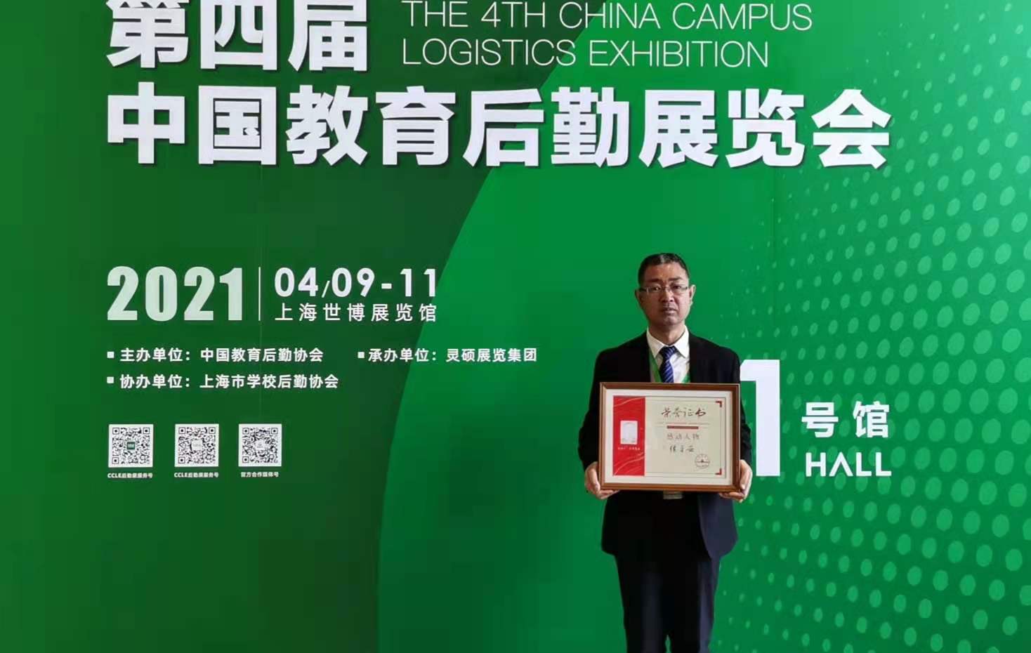 2021年4月9日-11日,由中国教育后勤协会主办的“2021中国教育后勤展览会”在上海举行,在“2021中国教育后勤展览会开幕式暨中国教育后勤研究院成立仪式”上,beat365后勤集团侯平安同志荣获“全国教育后勤系统2020年度感动人物”称号。