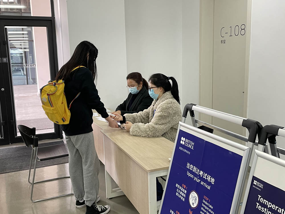 (图三)罗曼珊老师给考生体温测量登记