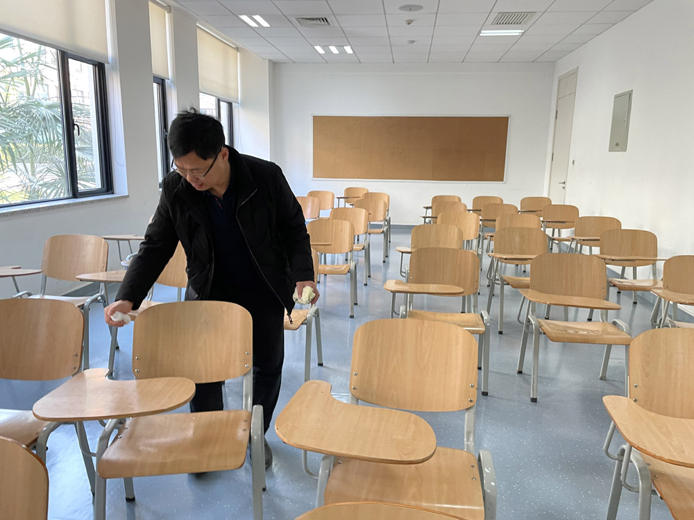 (图九)张浩老师在考生待考区进行消毒