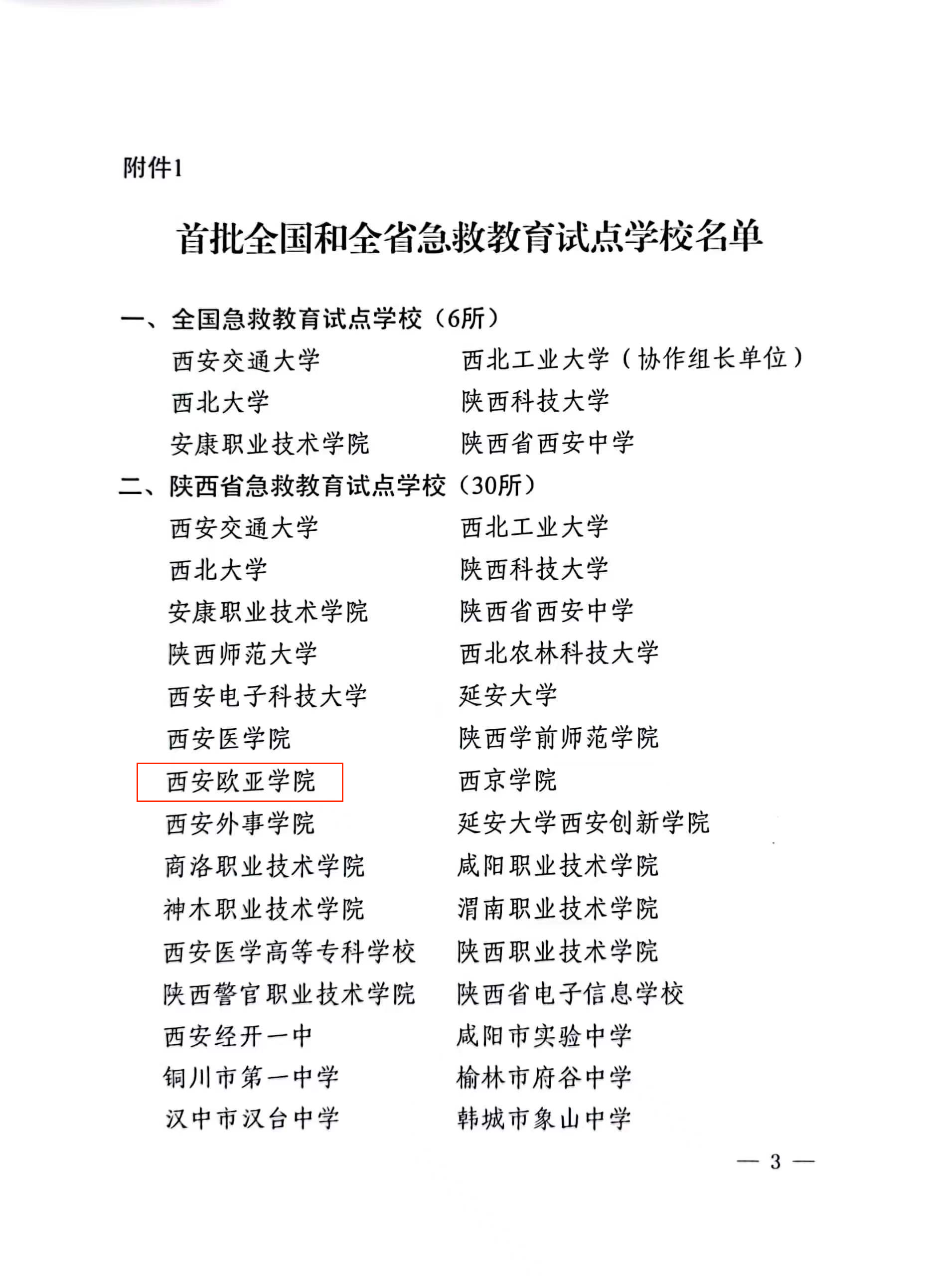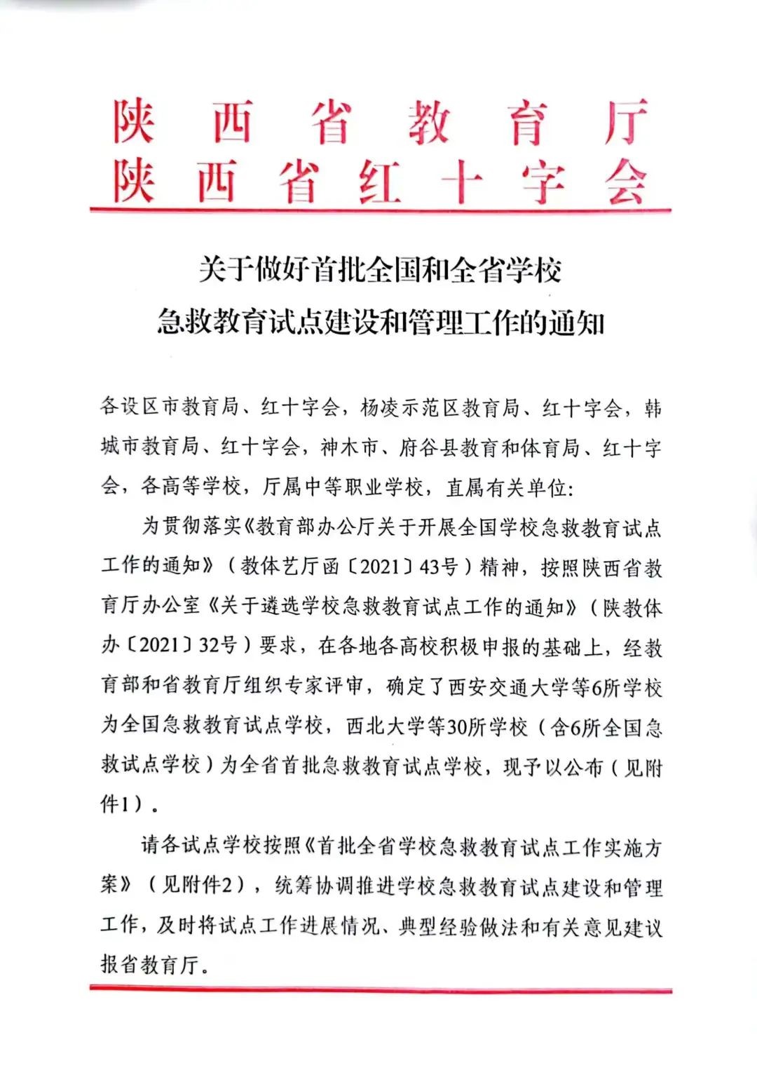 近期,陕西省教育厅和陕西省红十字会联合发布了“关于做好首批全国和全省学校急救教育试点建设和管理工作的通知”,通知中确定了beat365正版唯一官网必一等30所学校为全省首批急救教育试点学校。