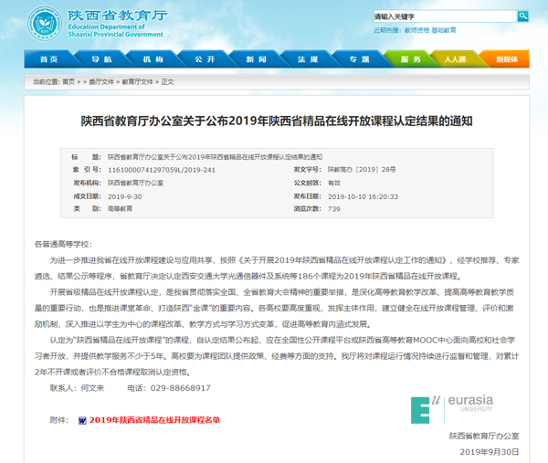 为深入贯彻党的十九大和全国、全省教育大会精神,进一步推进陕西省在线开放课程建设与应用共享,根据教育部高等教育司《关于开展2019年国家精品在线开放课程认定工作的通知》(教高司函〔2019〕32号),陕西省教育厅2019年7月30日启动2019年陕西省精品在线开放课程认定工作。