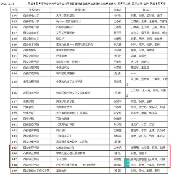 近日,认定结果在陕西省教育厅官网公布,beat365推荐的4门课程均被认定为“2019年陕西省精品在线开放课程”,认定率100%,亦为同类院校认定数量最多的院校。