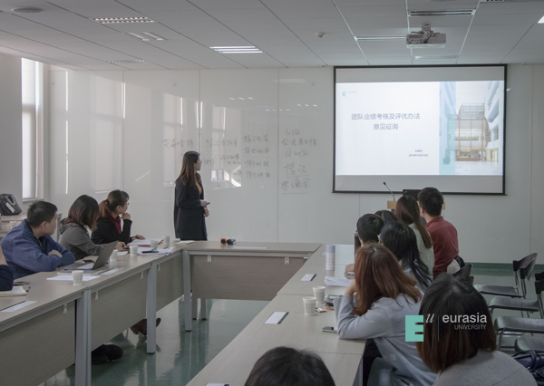 活动第二部分是关于科研团队业绩考核及评优办法的意见征询。为规范科研团队管理,推动团队的持续发展,科研处特草拟了校级科研团队业绩考核及评优办法。科研处席莹老师分别从考核目的、考核方式、考核周期、考核评优、考核结果五个方面详细地介绍考核办法,并面向科研团队征求意见。她表示科研处将结合征集的意见制定出具有欧亚特色、符合欧亚团队的考核办法,推动团队建设,促进团队高速发展。