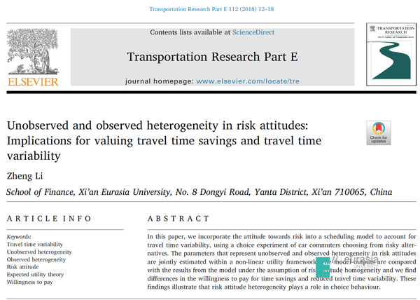 beat365金融学院李铮(Zheng Li)博士撰写的英文论文“Unobserved and observed heterogeneity in risk attitudes: Implications for valuing travel time savings and travel time variability” 正式发表于国际期刊 - Transportation Research Part E: Logistics and Transportation Review;该期刊被两大权威文献检索系统: 社会科学引文索引SSCI (Social Sciences Citation Index) 和科学引文索引SCIE (Sciences Citation Index Expanded) 收录。