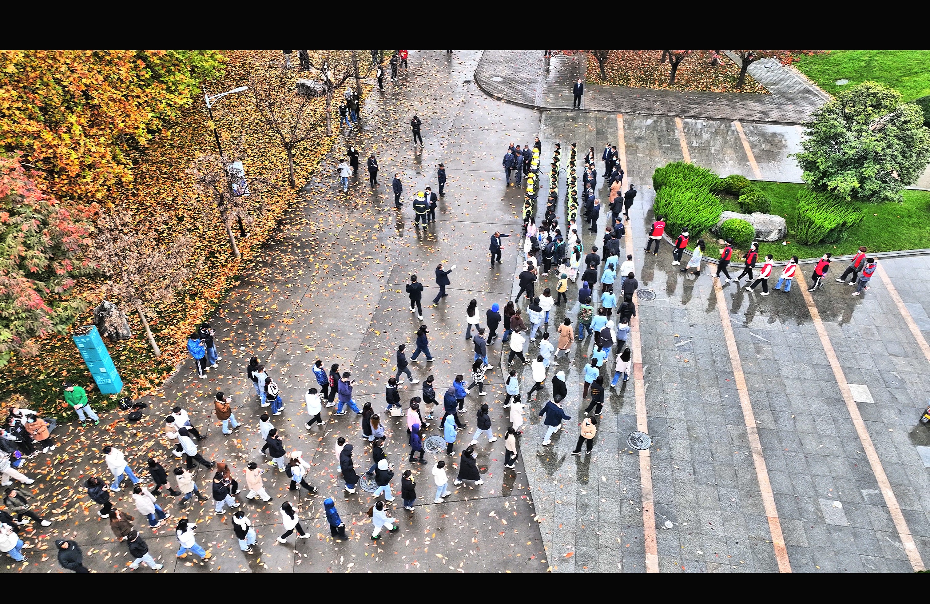 演练现场,图书馆西门道路两侧,两辆鸣着警笛的巡逻车引导多辆紧急车辆呼啸着赶到了现场。现场警戒组,根据现场的实际情况,设立警戒区,阻止闲杂人员进入警戒线,为抢救的人员、物资开辟通道,保障人员、物资迅速转移到安全地带。灭火行动组携带灭火器第一时间冲进现场,利用平时训练掌握的灭火技能,身着防护服,手提灭火器第一时间进入火灾事故现场控制火情,同一时间,后勤集团健康服务中心到现场做好伤员救护,公共服务中心迅速做好断电保护。