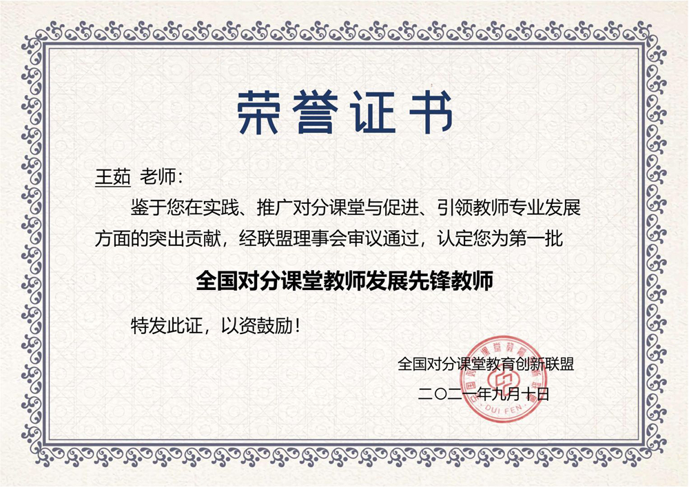2021年9月10日教师节,全国对分教育创新联盟隆重表彰首批“全国对分课堂教师发展先锋教师”,此次获得殊荣的入选教师全国共230名,来自普通高等教育、职业教育、高中、初中和小学五个领域。通识教育学院国际语言中心王茹老师荣获“首批全国对分课堂教师发展先锋教师”称号。