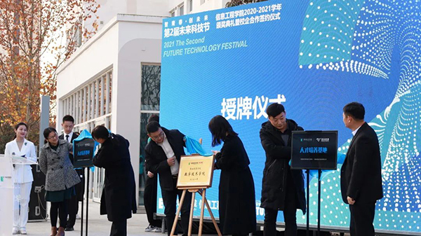 活动现场,信息工程学院与360安全科技股份有限公司、西安浪潮云创信息科技有限公司、西安未来国际信息股份有限公司签署了校企合作协议,与新华三技术有限公司共建的数字技术学院、与西安四维图新信息技术有限公司和美林数据技术股份有限公司共建的人才培养基地现场授牌。2021年,信息工程学院在校企合作方面更上一个台阶,目前已与美林数据、浪潮科创、四维图新、鸿腾智能、优软创新、核桃编程等16家企业达成校企合作,为学生高质量实习和就业打下坚实基础。