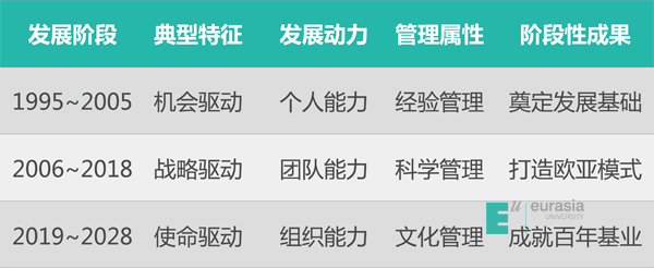 未来十年,欧亚学院将在使命驱动、愿景引领和价值观导向等文化管理要素的推动下,继续引领全行业。从战略驱动转向使命驱动,这是一个追求卓越的组织在宏大愿景召唤下的两个不同发展阶段,价值观将逐渐消融为组织基因并高效内化为全体员工的卓越行为,欧亚学院的百年基业至此才能真正拥有磐石般坚实的发展根基。