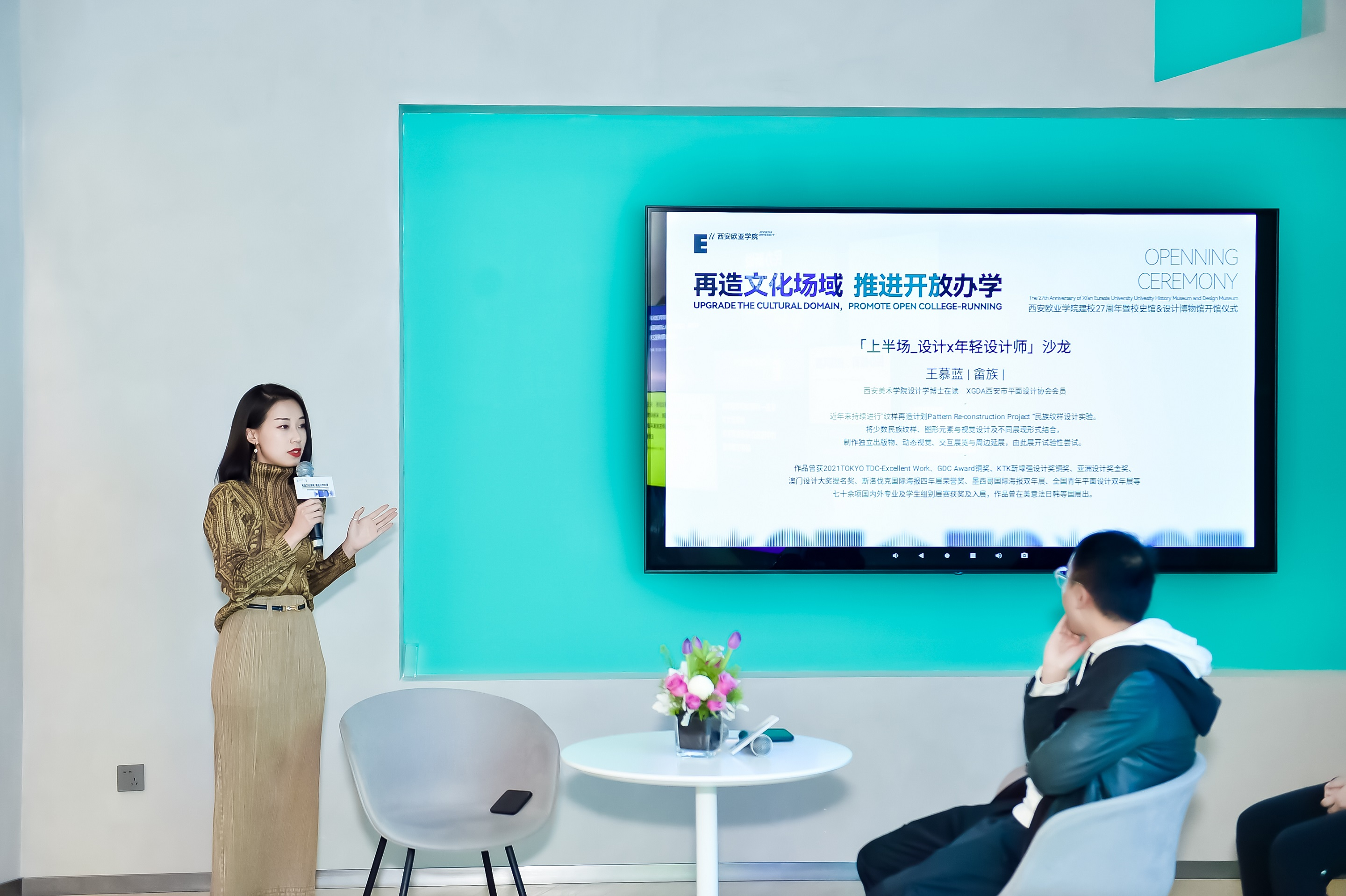 西安美术学院设计学在读博士、XGDA西安市平面设计协会会员王慕蓝分享了自己的创作实践。作为少数民族畲族,王慕蓝从本科、研究生、博士学习中,一直在突破和尝试的方向,从创作基于少数民族语言语系的作品,到西安设计展主视觉的动态,“设计语言要为作品主体和传递的内容服务,作品也需要承载更多文化属性。”