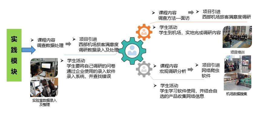 其次,将每一个阶段所对应的内容进行分解,并与《市场调查实务》的课程内容进行结合。在其他高校,这门课程叫做《市场调查分析与预测》,而我们更强调“实务”,我们希望学生在分析之前能够清楚地了解市场运营的整个环节。
