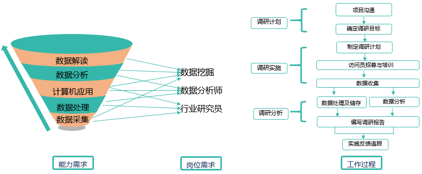 A:这是经济统计学专业应用性特别强的一个课程,属于社会实践课程的一部分。我们在这门课程的设计之初,走访了非常多的数据分析类、市场调研类的公司,把市场当中所有跟市场调研相关的工作流程都做了梳理,然后将完整的工作流程分成了三个环节:实施计划阶段、实施阶段和实施的分析阶段。