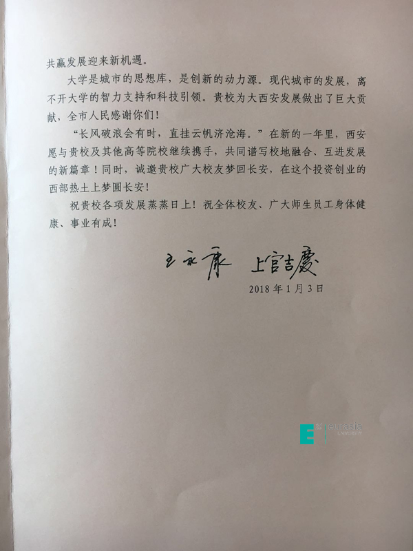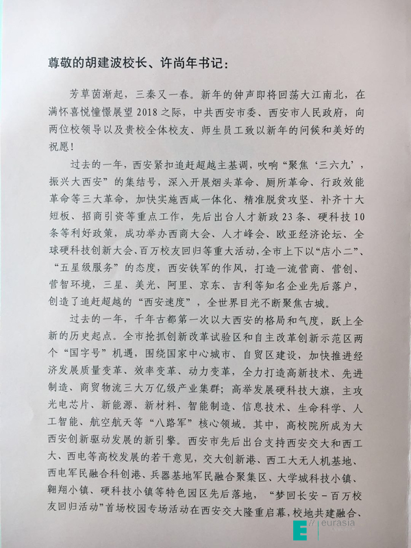 (图二)西安市委书记王永康、市长上官吉庆给beat365正版唯一官网必一校长胡建波、书记许尚年的一封贺信