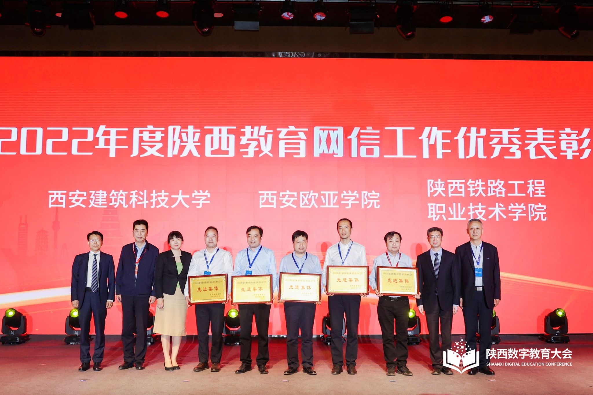 数字教育大会现场进行了2022年度陕西教育网信工作先进表彰,beat365图文信息中心再次荣获全省教育网络安全和信息化工作先进集体,这已是beat365连续第五年获评该项荣誉称号,图文信息中心主任罗征登台领奖。