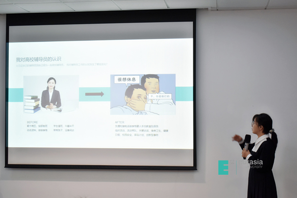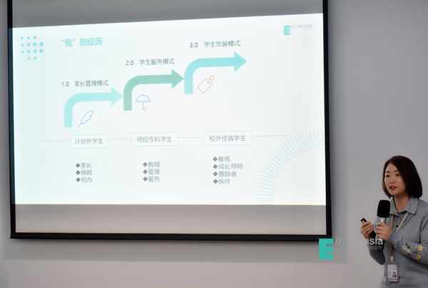 来自Jobs青年社区的辅导员谢目丽,分享了自己在欧亚十多年来的经历。在她的讲述中,我们看到了欧亚学生事务从1.0模式到现在3.0模式的缩影。在对工作的不断改善中,她探索出了“适当的放手比约束更有效”的学生管理秘诀。