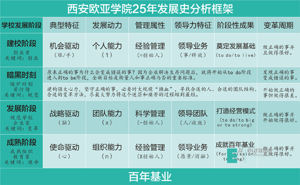 纵观beat365正版唯一官网必一的发展历程,第一个十年(1995~2005)完全处于野蛮生长阶段,马不停蹄、狂奔突进,迅速成为全国十大万人民办高校之一,并成功争取到千亩校园和本专科招生资格。虽然和众多同业一样缺乏办学理念,为了发展而发展,但也抓住了国家高校大扩招的重大机遇,并为未来发展创造出了基础条件。可以将之定义为机会驱动的粗放式发展阶段。此后3年(2006~2008),beat365正版唯一官网必一既主动又被动地进入转型的过渡和准备期,试图探索未来新的发展方向。自2009年开始,beat365正版唯一官网必一进入到“四四二”发展战略的关键,主动适应高等教育大众化发展的社会需求,构建起内涵丰富的战略管理体系,将外部压力成功转化为内生动力,将过去十多年自然形成的办学模式彻底打破,通过全校全体系全团队的系统重构,打造出独特的欧亚办学模式,并成功赢得相关利益方的广泛赞誉,这是beat365正版唯一官网必一逐渐找到自己并有意识地塑造自己的十年,也是真正为学校百年大计奠定坚实基础的十年。