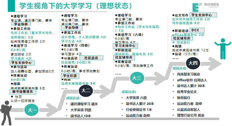 基于上述活动中发现的问题,结合大学4年的学习生活及职业规划,学习支持中心第二次工作坊将引导你绘制自己的专属学习地图。我们将尝试跳出传统教师视角,真正从你的视角来规划自己的大学生活,从大一至大四,在包括课程学习、社团活动、英语学习、工作坊、公益活动等方面如何规划及分配时间,确定清晰的学习路径,让你每一天学习及生活都有的放矢。