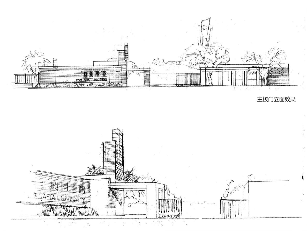 欧亚东大门的方案最让人纠结。在图书馆设计之前,我们已经委托设计师先后做了三个方案,均拿不定主意。图书馆完成以后,我们还希望关先生拨冗设计这个小项目,没想到关先生不仅愉快接受了这个设计项目,而且非常用心,亲自手绘了不少效果草图,最后的方案也非常出彩。东大门外的东仪路南段是一个斜向的南北路,如果大门设计成正东方向,就会与东仪路形成一个不小的夹角;如果设计成与东仪路平行,东大门就成了一个斜门,与校园道路不平行。关先生最终的设计将东门两翼设计成角度不一致的八字形,消除了与东仪路南段的夹角感受,东门也保持了正东的方向。