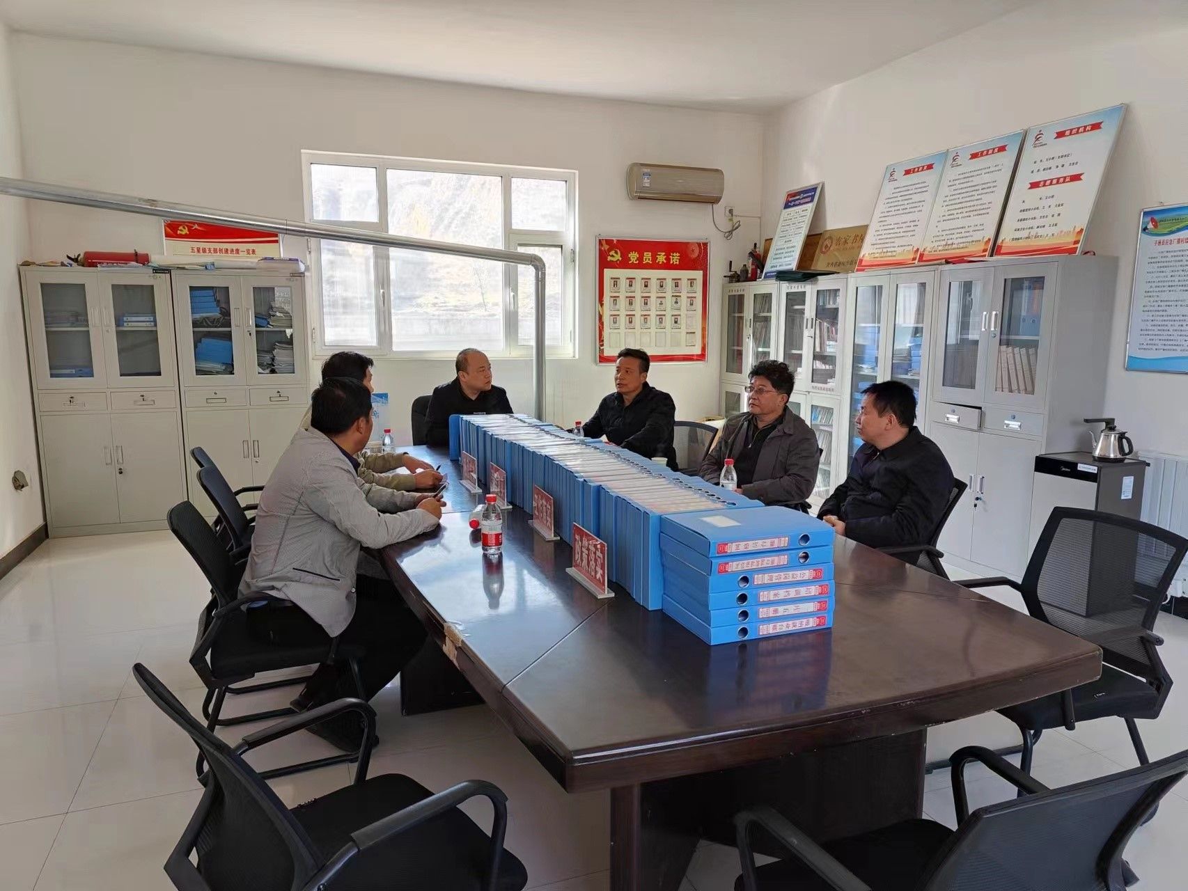 3月14日,在村会议室,于孟晨、晏建忠、赖志彬和子洲县副县长庞永超听取了驻村工作队汇报。