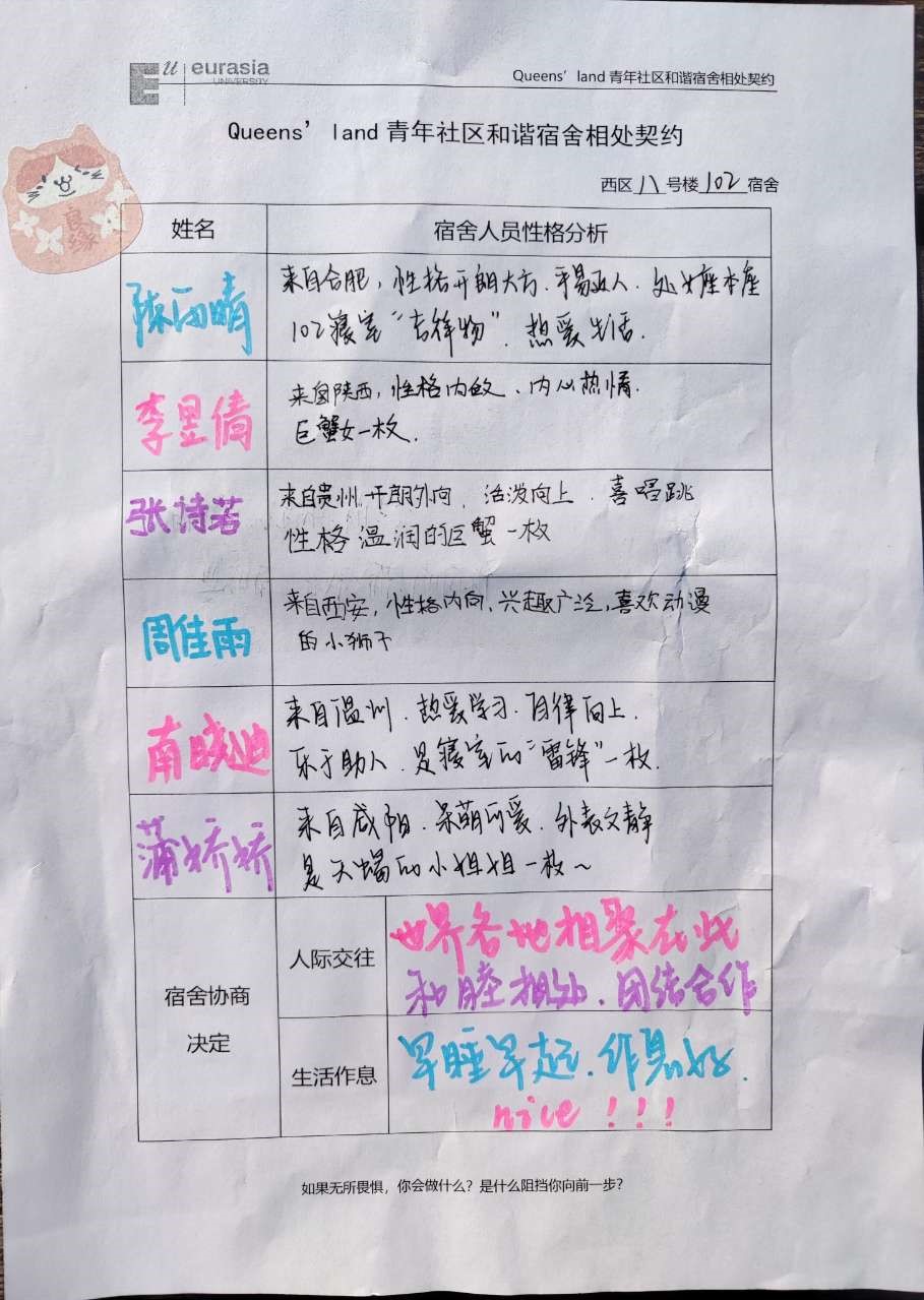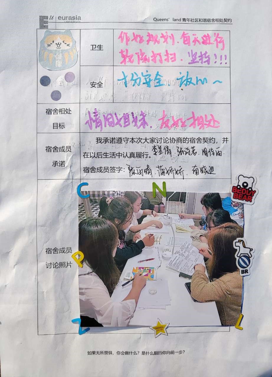 刚进入大学宿舍生活,每个人的兴趣爱好,生活习惯等都有所不同。在宿舍生活中,良好的宿舍关系,可以增强学生对社区文化的认同感。在本次入学教育中,一次轻松愉快的“扩列”玩法,通过宿舍公约设立、宿舍仪式设置等环节,进一步促使新生之间互相熟悉,形成良好的宿舍生活氛围。而在随后开展的公开演讲活动中,小萌新们通过公开演讲竞选宿舍长。不仅在生活的真实场景里发散思维训练,也是一次凝聚宿舍团队力量的契机。