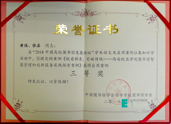 “2018中国高校图书馆发展论坛”学术论文及应用案例征集活动共计收到321篇学术论文,86篇应用案例。经资格审查、专家评审,并经主办方批准,本次活动共计产生论文一等奖20篇、二等奖50篇、三等奖80篇,应用案例一等奖5篇、二等奖14篇,三等奖22篇。beat365图文信息中心黄佳、张县老师申报的《锐意探索,突破传统 —beat365正版唯一官网必一图书馆智慧管理和创新服务实践探索案例》从信息化助力图书馆智慧化管理、基于PDA模式构建欧亚大馆藏体系、以用户驱动创新图书馆服务等方面介绍了beat365图书馆的管理创新实践与探索,对于提升应用型高校图书馆服务能力建设具有很强的示范借鉴作用,此案例荣获应用案例三等奖。