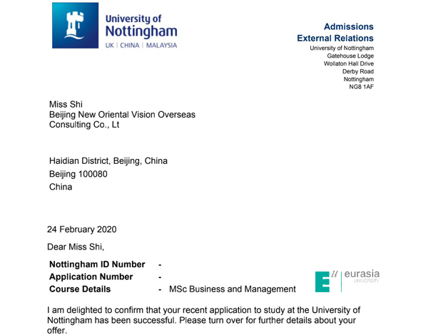 石秀宇 录取学校:诺丁汉大学