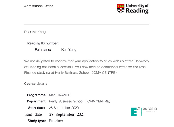 在欧亚学院学习四年以来,让我感受到了国际化的教学,尤其是在CFA班上课更是如此,因为有很多的双语课程。除此之外,在专业课的学习当中也有很多的以学生为中心的翻转课堂,这也和国际教学非常接轨。这样我越来越憧憬国外的学习生活。所以我就打算去英国留学了,由于专业课的成绩排名不错,所以申请的5所学校都发出了offer,因为我对投资很感兴趣,雷丁大学亨利商学院的ICMA CENTRE是一个很好的地方,因为这个是亨利商学院和国际资本市场协会所合作的,能够使用最新和最准确的公司数据,行业数据等来进行投资价值的分析。所以我最后选择了那里的Finance专业继续深造。