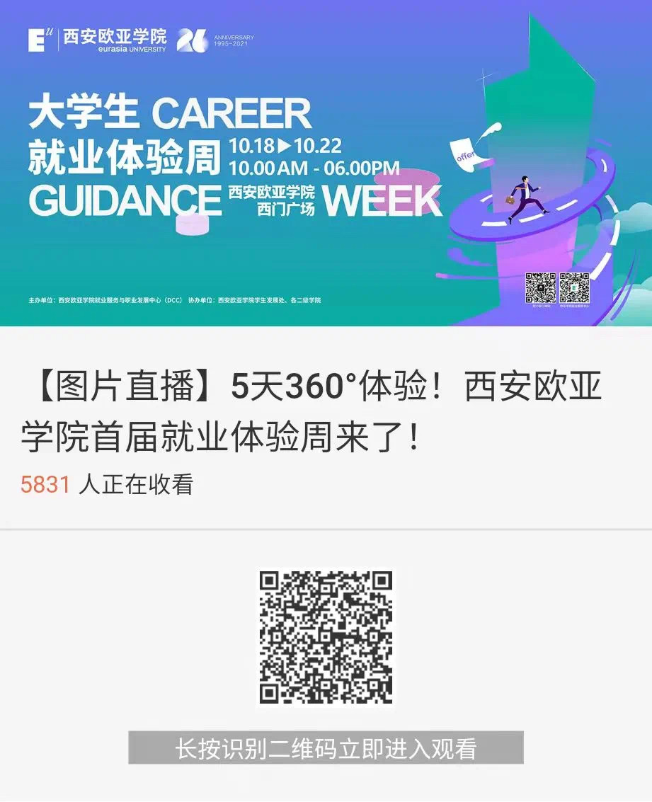 2021年恰逢欧亚建校26周年,值此校庆之际,为推动学校大职涯发展教育体系的落地实施,进一步激发学生的内在就业动力,引导学生梳理自我能力,深入了解职场,做好求职准备。beat365就业服务与职业发展中心特别推出首届就业体验周活动。