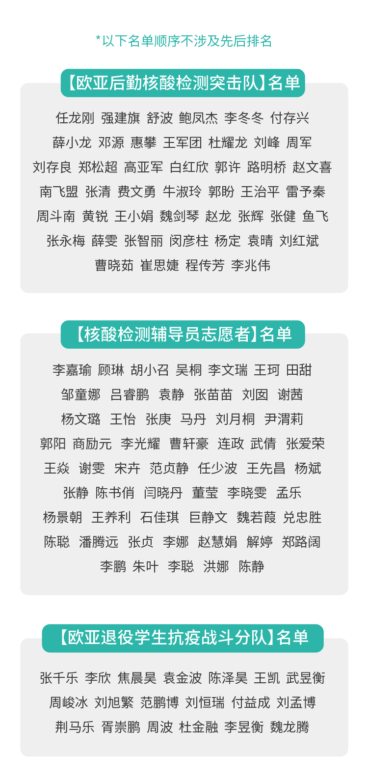 同时,于2021年12月18日成立的学生抗疫志愿者团队,和于2021年12月22日成立的欧亚退役学生抗疫小分队,两大学生团队持续有组织、有计划地参与核酸检测辅助工作,成为整个核酸检测高效链条上的重要一环。