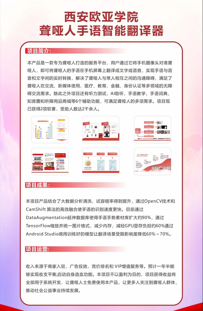 聋哑人手语智能翻译器是一款由工商管理学院学生专为聋哑人打造的服务软件,借助翻译器可以将聋哑人的手语翻译成文字和语音,实现手语与语音和文字间的实时转换,进而帮助聋哑人进行正常的社交活动,解决了聋哑人与正常人以及聋哑人相互之间的沟通障碍,帮助听力言语障碍困难群体在使用新媒体、医疗、教育、金融、身份认证等多领域的无障碍交流需求,项目现已获得2项软著。
