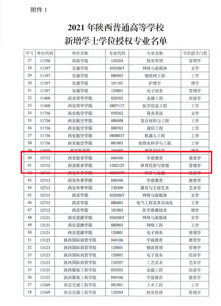 目前接陕西省学位委员会正式文件——《关于2021年陕西普通高等学校新增学士学位授权专业及部分专业调整学士学位授权的批复》(陕学位〔2021〕5号),beat365学前教育、体育与经济管理两个专业已顺利获得学士学位授权,截至目前为止,beat365已有37个新增本科专业获得学士学位授权。