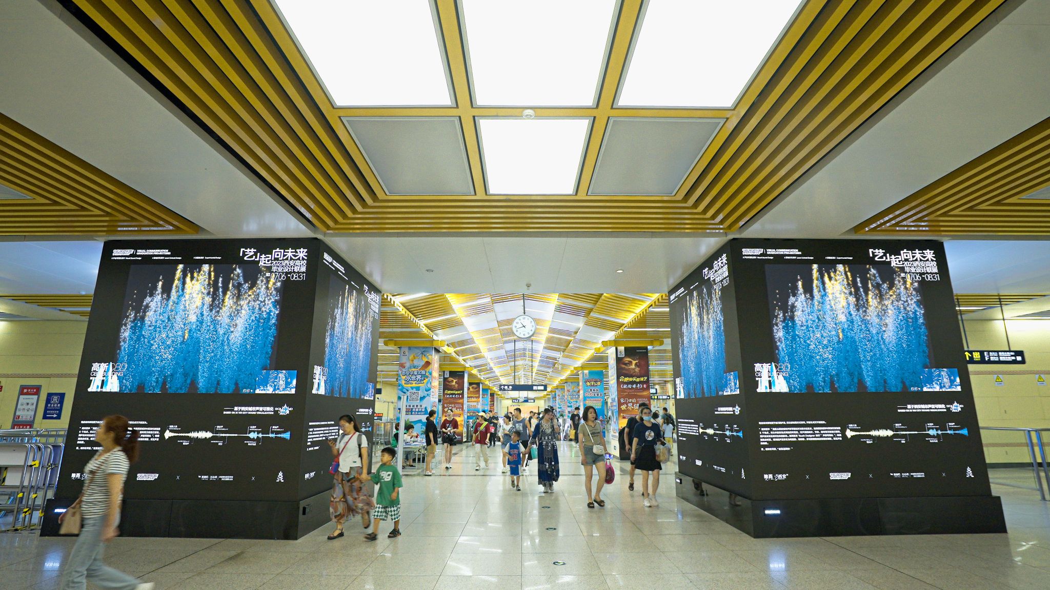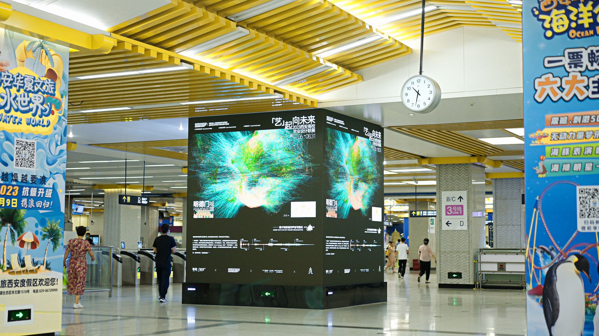 在地铁展区,展出作品融合视觉、科技、声音可视化的交互等多种艺术形式。满足公众观感体验的同时更有互动装置,在视觉记忆之外为观众带来另一个视角的沉浸式艺术体验。