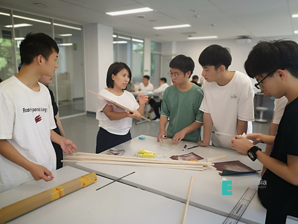 项目组以公园里的休闲空间为设计主题,先进行空间的初步设计,确定空间的平面和立面,然后对方木条进行计算和加工,大家对木条进行削、切、打磨等处理,采用方木条框架结构,保持了木构空间的结构完整性和坚固性。一根根木条,在设计者的手中经过打磨,变成了设计创意和项目实践的强有力表达,木构空间作品的美丽和魅力如夏花般绽放。