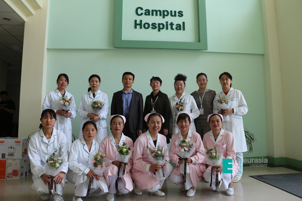 在第108个5月12日国际护士节到来之际,工会副主席晏建忠等工会人员及后勤集团领导,携带礼品慰问学校门诊部医护人员。
